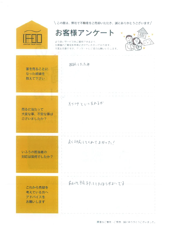 売主様アンケート~大分市 かたしま台~ Posted 2025年12月6日 by ifoo-Staff 売主様 この度はご売却をお任せいただき、ありがとうございました。 アンケートでのお言葉も大変励みになりました。 今後とも何かございましたら、どうぞお気軽にご相談ください。