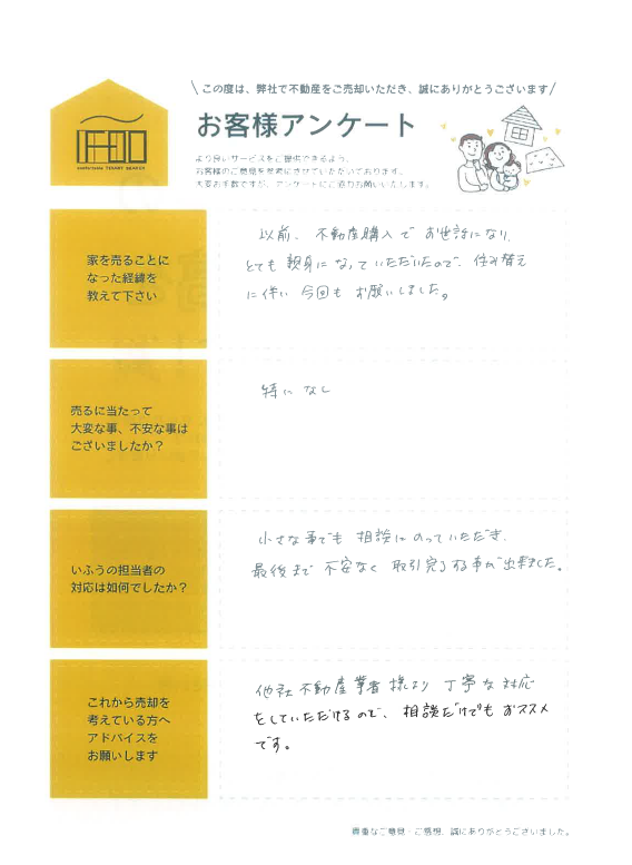 売主様アンケート~大分市 千歳~ Posted 2025年12月6日 by ifoo-Staff 売主様 この度はご売却をお任せいただき、ありがとうございました。 最後まで不安なく取引完了することが出来たと嬉しいお言葉ありがとうございます。 今後とも何かございましたら、どうぞお気軽にご相談ください。