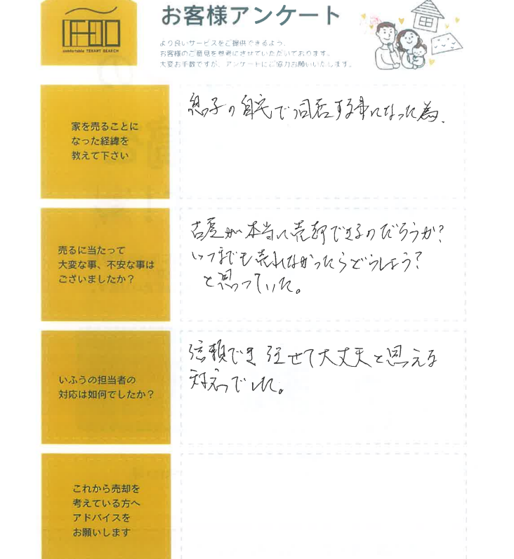 売主様アンケート~大分市生石~ Posted 2026年3月12日 by ifoo-Staff 20260312125120 売主様 当社にて不動産の販売を任せていただき誠にありがとうございました。 信頼していただけたことがとても嬉しく思います! また当社でお役にたてることがございましたら、ぜひご相談ください。