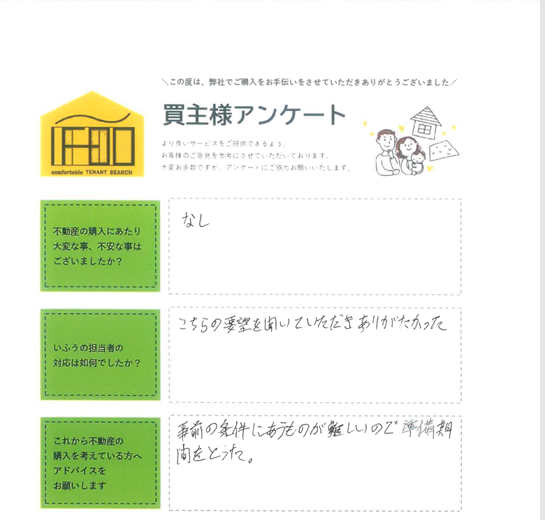 買主様アンケート~大分市 富士見が丘東~ Posted 2025年12月20日 by ifoo-Staff 買主様 この度はご購入いただき、誠にありがとうございました。 条件に合う物件が見つかり大変うれしく思います。 今後ともよろしくお願いいたします!